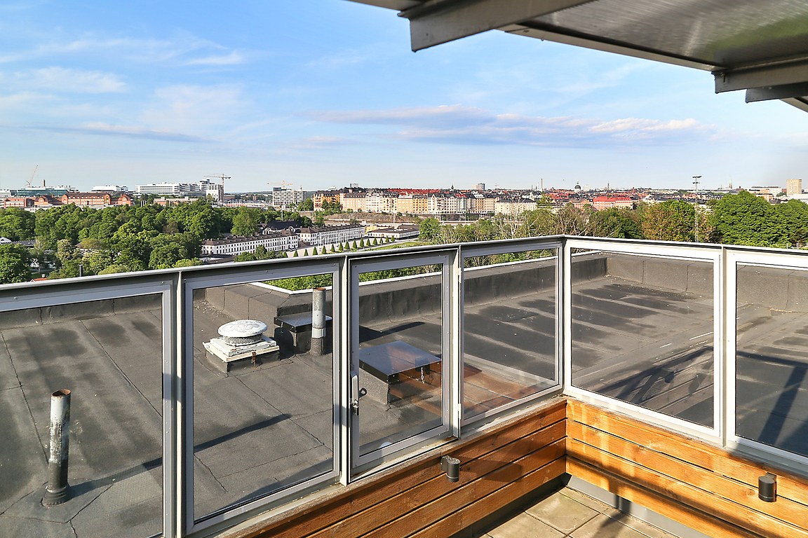 Våra takterrasser har kvällsbelysning och vacker utsikt över Stadshagsparken, Karlbergs slott och mot fasaderna i Vasastan.