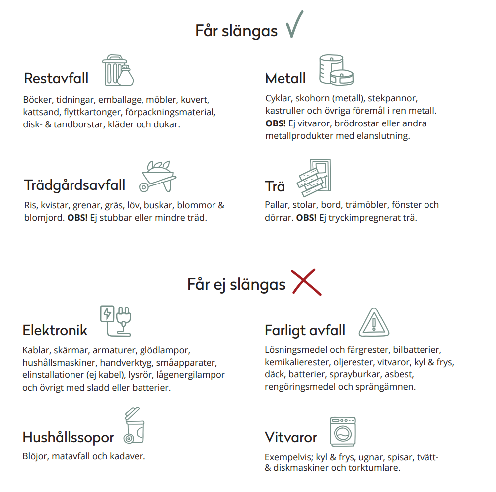 Viktigt att ni alla följer nedanstående sorteringsguide och regelverk avseende vad som får slängas/inte slängas. I annat fall innebär det stora merkostnader för föreningen.