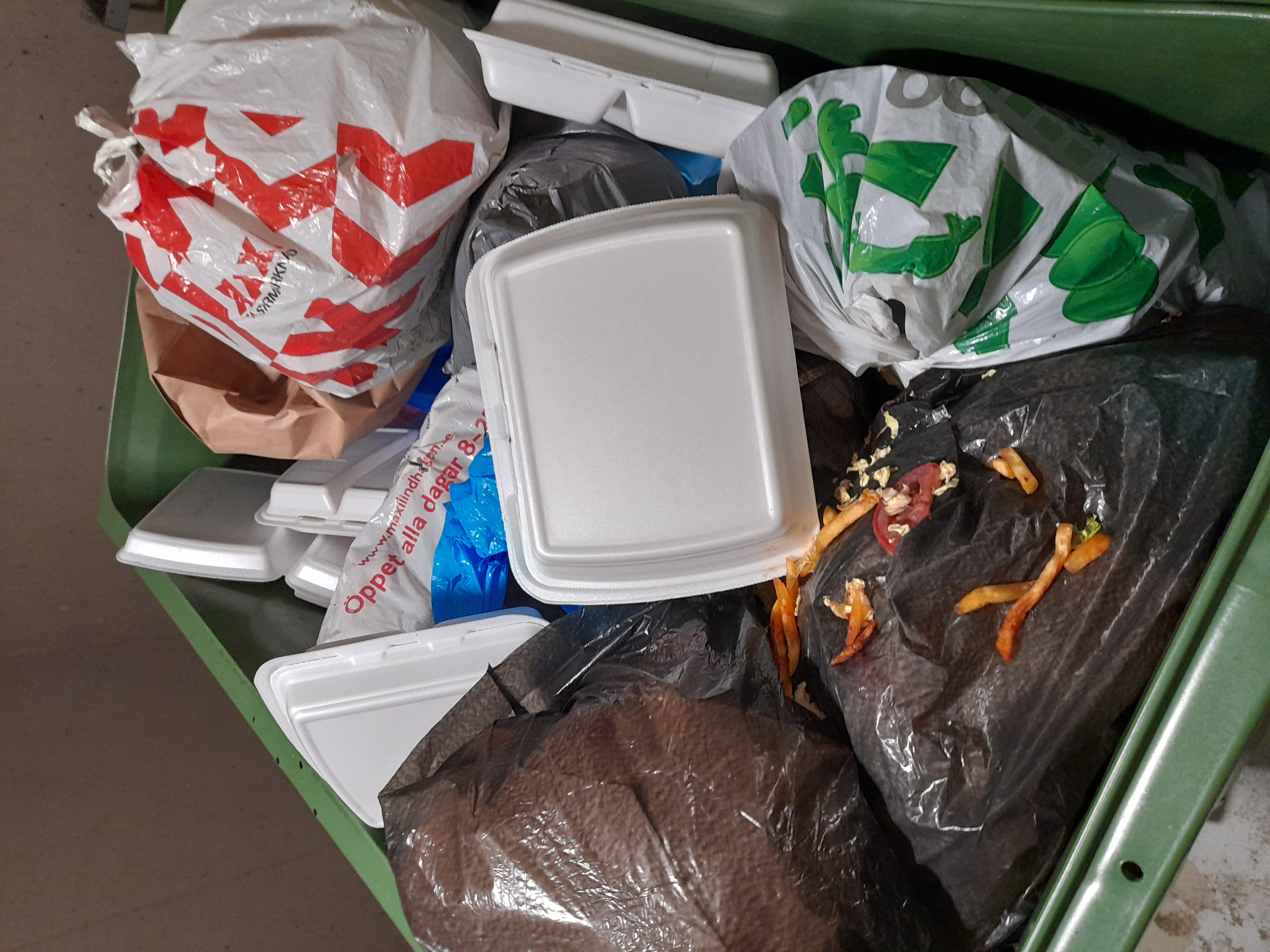 På bilden ovan framgår ett exempel på hur det absolut inte får se ut. Det kostar föreningen extra att städa kärlet när matrester kladdar ner det, och frigolit ska dessutom sorteras ut som plast i de gröna containrarna på gatan. Om man slänger för stora påsar kan det också bli stopp i röret.