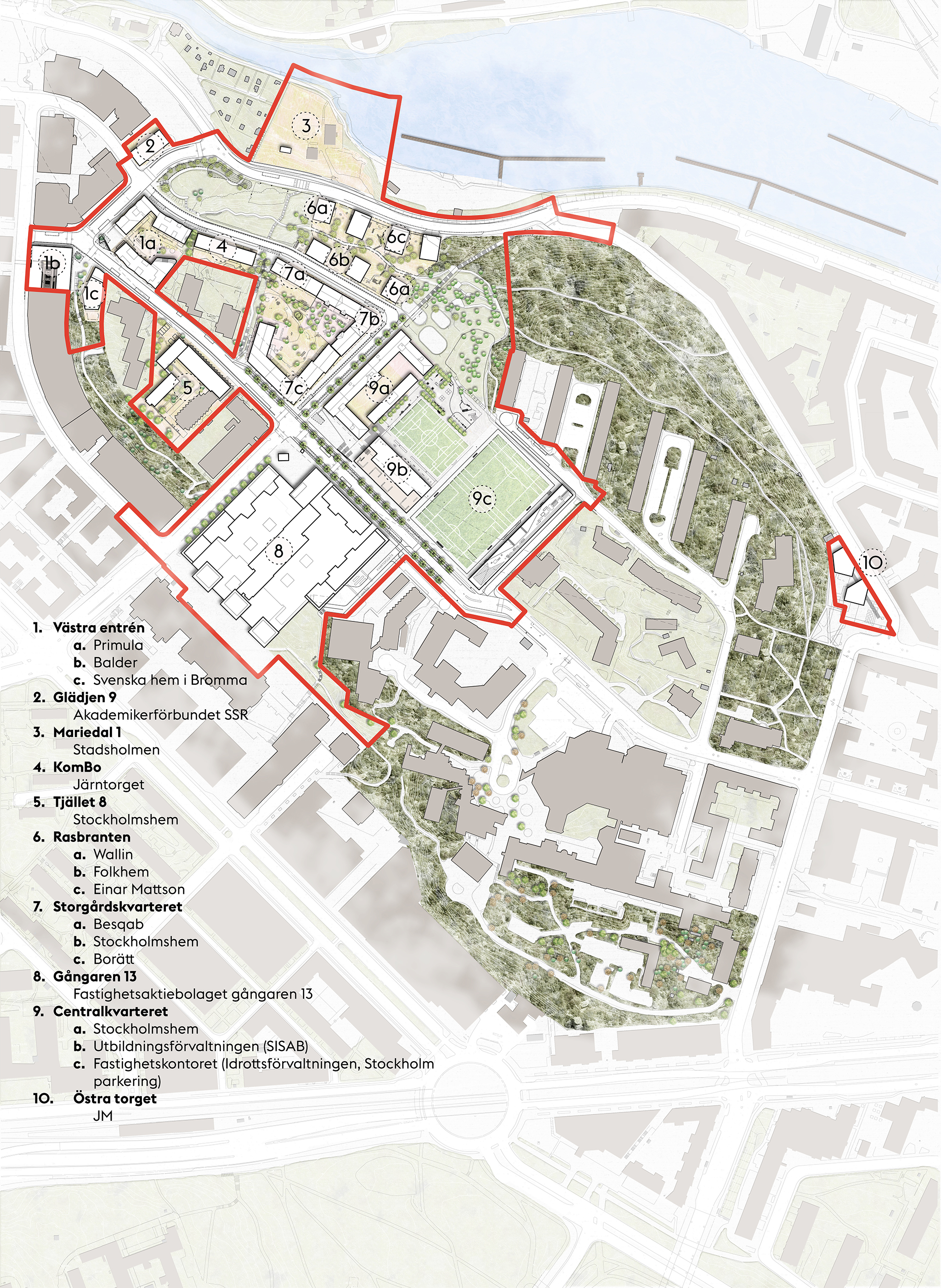 Byggaktörerna startar nu sitt arbete, och först ut är Primula (1a på ovan illustration). Primula bygger ett 8-våningshus i u-form och ett 15-våningshus mitt emot tunnelbanan i korsningen Mariedalsvägen/Sankt Göransgatan. Husen kommer att innehålla hyreslägenheter, förskola, garage och en livsmedelsaffär på 700 m2.