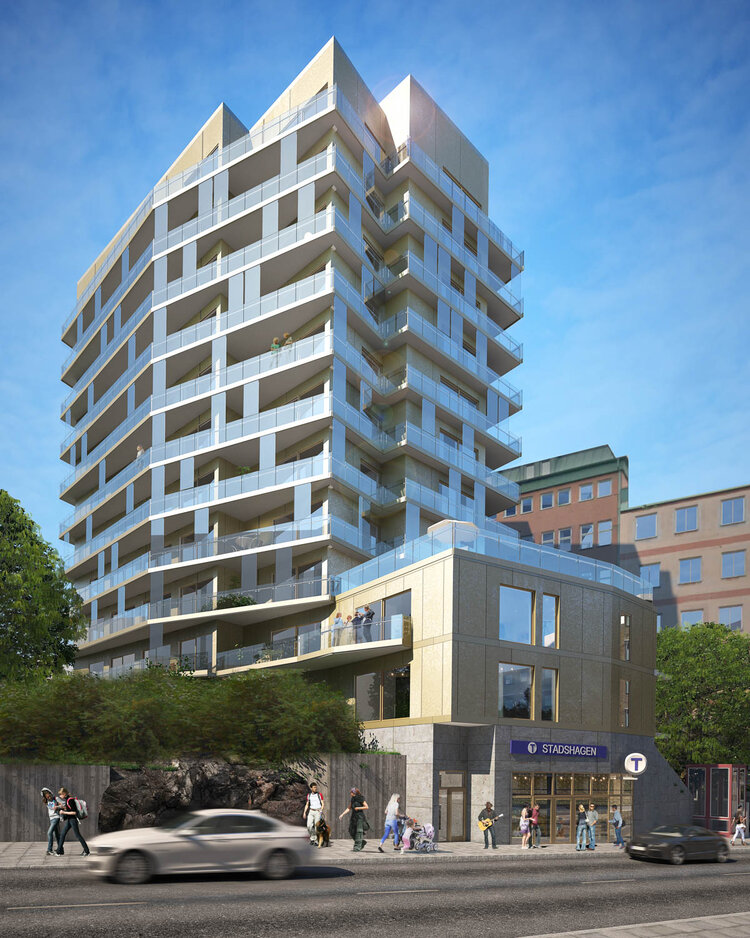 Bilden ovan visar vyn över det nya huset ovanför tunnelbanestationen Stadshagen, korsningen Mariedalsvägen/Sankt Göransgatan. Huset kommer ligga mitt emot Primulas nybyggnation.